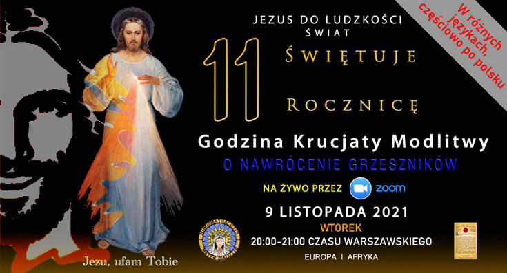 Z okazji 11. rocznicy rozpoczęcia Misji Jezus do Ludzkości, zapraszamy na międzynarodowe spotkanie Krucjaty Modlitwy we wtorek 9 listopada 2021, o godz. 20:00. Spotkanie będzie prowadzone w wielu językach, w części także po polsku.